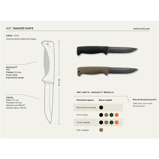 Nůž Ranger navrhl kapitán finských obranných sil J-P Peltonen. Čepel z uhlíkové oceli s teflonovým povrchem, rukojeť z polymeru Thermoflex, kompozitní pouzdro.