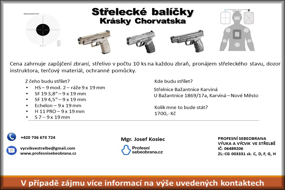 Nejenom slunné pobřeží je doménou Chorvatska. Kdo se pohybuje ve zbrojním průmyslu, tak ví, že kvalita a nadčasové zpracování těchto krásek nadchlo již mnohé příznivce střelectví. Cena zahrnuje zapůjčení zbraní, střelivo v počtu 10 ks na každou zbraň, pronájem střeleckého stavu, dozor instruktora, terčový materiál, ochranné pomůcky.